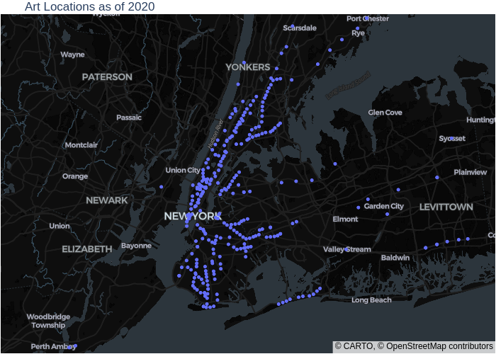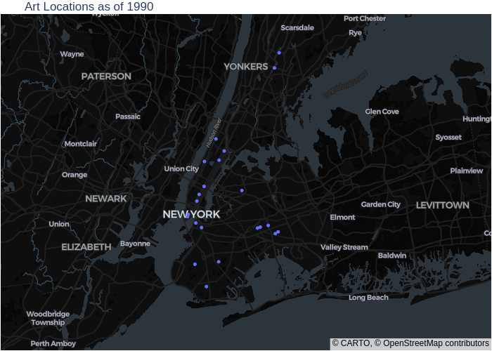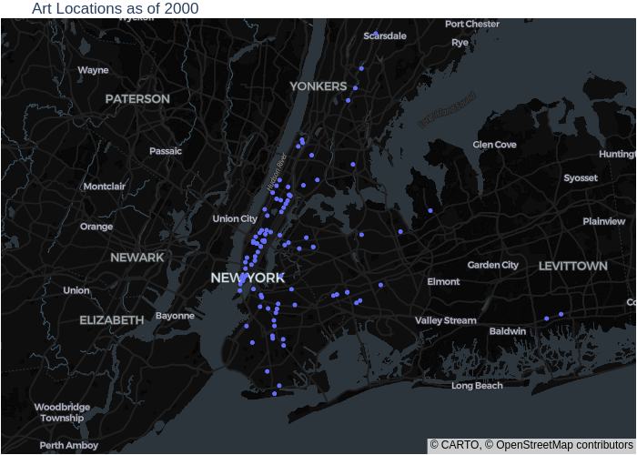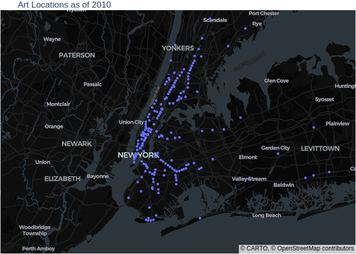 When we plot art installations by location, grouped by decade, we see the definite shape of the transit network becoming visible as art is installed.