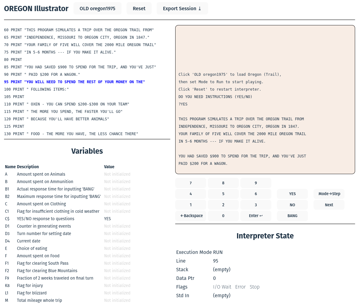 To aid in studying OREGON, we built a limited interpreter for HP Timesharing BASIC with debugger-like visibility and controls. Called OREGON Illustrator, you can play OREGON while watching the source code execute in parallel.